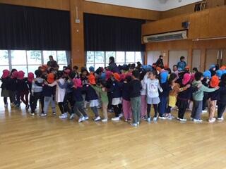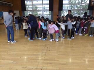 コスモスホールでの交流会。司会進行役の人や、それぞれの企画担当の人たちが上手に進めていきました。じゃんけん列車、ずいずいずっころ橋、花いちもんめなど、一緒に遊びながら交流しました。教室では緊張気味だった年長さんたちも、楽しそうな表情で過ごすことができ、良かったです。お互いへのプレゼントを交換し、楽しい絵は終了しました。