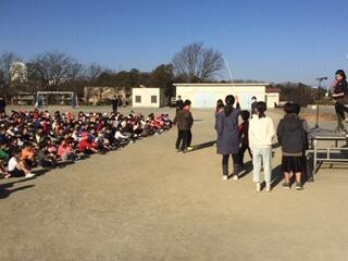 朝会の最後に、運動委員会の人たちが、大繩跳び大会のことについて説明をしてくれました。実演をしながら、ルールや進め方などを教えてくれました。