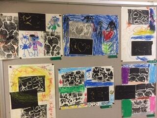 紙版画の手法による素敵な作品を紹介します。まず、わかくさ学級の1年生と2年生の人たちが取り組んだ、「紙はんがのせかい」です。紙はんがで刷った絵と、クレヨンでの絵を組み合わせて、思い思いのせかいを表現しました。