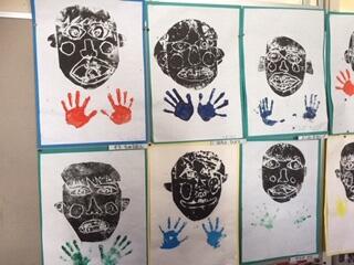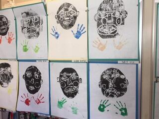 次は、2年生の作品です。紙はんがの手法を使って、自分の顔を作りました。葉や目など、細かなところまで意識しながら作っていきました。色絵の具で自分の手形を押し、台紙に張り付けて、作品完成です!
