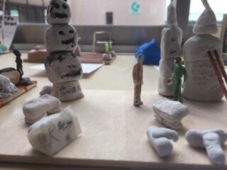 2階の廊下の窓際に展示された作品。5年生が図工で取り組んだ「人生劇場」という作品です。身長2cmほどの小さな人形を使いながら、それぞれ思い思いの場面をイメージして作品にしていきました。どこか哀愁を感じさせる作品もありました。