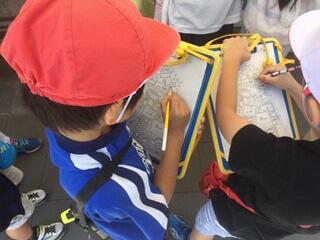 探検ボードに学校周辺の白地図を各自持ちながら、見聞きした情報を地図上に記録していきました。「今、この地図だと、ここにいるのかな?」と地図と実際の場所の関係について興味関心を持っていました。
