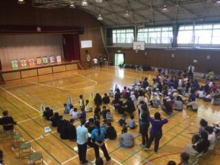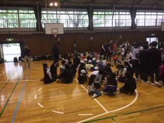 9時50分。永山小の体育館に6校の児童生徒、教職員、保護者のみなさんが集い、合同交流会がスタートしました。司会進行は、中学生のみなさんが行いました。さすが中学生!立派に役割を果たす姿が素敵でした。前半の全員合唱は「ともだちになるために」です。歌を歌い、声をだすことで、みんな緊張感が和らいできたように見えました。