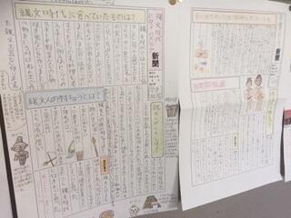 その学習成果のひとつとして、「歴史新聞」を作っています。今、教室前の廊下の壁に掲示してあります。これからどんな新聞ができ、増えていくのか。楽しみです。