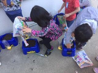 1年生の生活科の様子です。生活科の学習で、朝顔を種から育てる活動に取り組みます。一人一人の真新しい鉢植えに、土を入れ、朝顔の種を植えていきました。これから水やりをやったり、成長の様子を観察したりしながら学習を積み重ねていきます。いつ芽が出るかなぁ。楽しみですね。