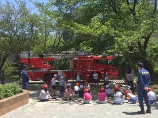 消防車の特徴を、細かなところまで見て、絵に描きこんでいました。消防士の方が、実際に消火する時の装備をつけてくださり、子供たちはうれしそうに描いていました。