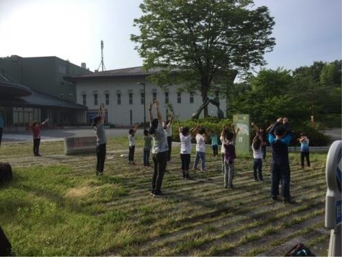 みんな元気に起きてきました。さぁ、2日目の活動がスタートです。外で朝の集いです。1年生と2年生が進行役、頑張りました。