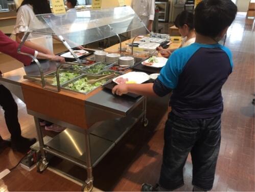 さぁ、朝ごはんを食べましょう。朝食は、バイキングです。食べられる分だけ、上手にとりましょう。