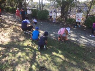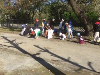 たてわり班ごとに集まり、担当する場所で落ち葉や木の枝、雑草や小石等を拾い集めました。6年生を中心に、班で声をかけあいながら取り組むことができました。