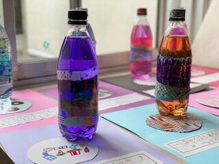 わかくさ学級、1~3年生たちの図工の作品です。からのペットボトルに、色とりどりの飾り用のテープや、マジックペンを使って思い思いの模様を付けました。中に水を入れ、数色の中からお気に入りの塗料を選び、1滴・2滴と垂らし、濃さを調整していました。飾るだけでなんだか涼しげで、いいですねー。