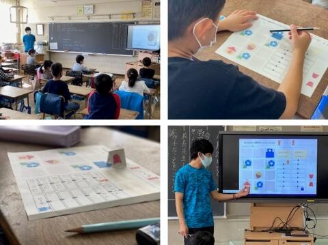 3年生のプログラミング学習の様子です。3年生は、一人一台タブレットを使って取り組みました。「ロイロノート」というアプリケーションを使って、必要な文字を入力したり、写真を撮って取り込んだり、画面上にある複数のシートを組み合わせたり、順番を入れ替えたりしながら、自分の考え、思考を整理したりすることもできます。