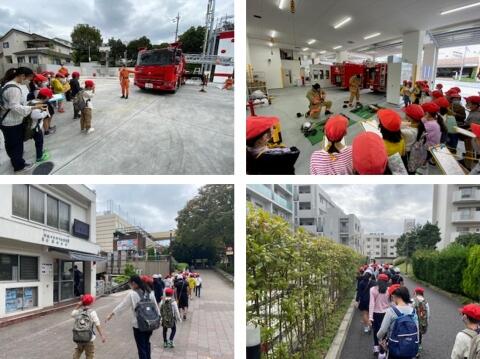 前半は1組、後半は2組とクラスごとに時差をつけて見学をさせていただきました。まず、ポンプ車について見学をしたり、説明を伺ったりしました。いろいろなところを開けて、中に入っている道具やその役割等について教えてくださいました。ポンプ車にはホースがたくさん積まれていること、街中にある「消火栓」から水を吸い上げること、ポンプ車の後ろの扉を開けると、小さな車が入っていて、狭い所でも進んでいけることなど知ることができました。はしご車の見学では、ちょうどタイミングよく、点検で梯子が伸ばされた状態で横たわっていました。「バスケット」と呼ばれる、人が乗るところも間近で見ることができました。はしごは、30m伸び、10階だてのビルくらいまで届くそうです。