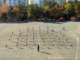 3年生が校庭で表現運動をしているところです。手に持っている色とりどりのポンポン。その後ろには色づいてきた校庭に木々の葉。どてもきれいに色彩の共演です。