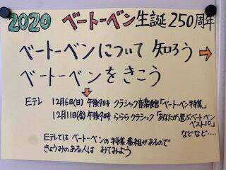今、音楽室前の廊下の壁に、ベートーヴェンについての掲示があります。私も、それを見て、いろいろ学びました。テレビなどで取り上げる番組があることも紹介されていました。