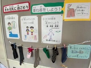 保健だよりでも触れていますし、今保健室の前の廊下の壁に掲示もされています。重ね着のポイントや、具体例として、「寒い日にはどんな靴下をはくと良いか。」などについても考えるヒントがあります。
