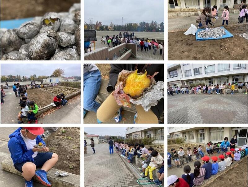 朝から用務主事さんたちが、焼き芋をするための火を起こし、ちょうど良いおき火状態にしてくれました。