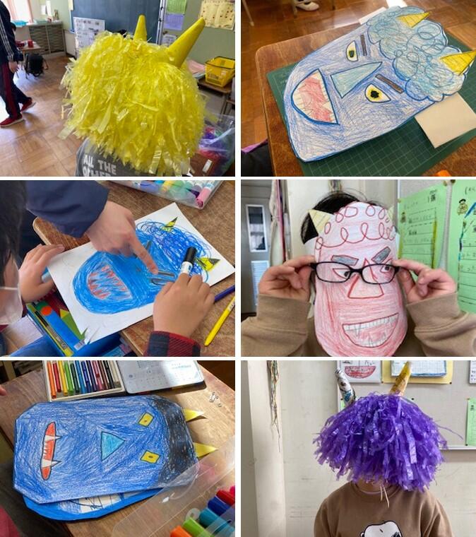 わかくさ学級の4組でも、それぞれ追い出したい鬼を考えながら鬼のお面を作ったり、頭に角を付けてみたりと、仲間と楽しみながら活動をしました。はじめは嫌がっていましたが、鬼に扮してみると、意外と気に入ったようです。