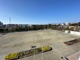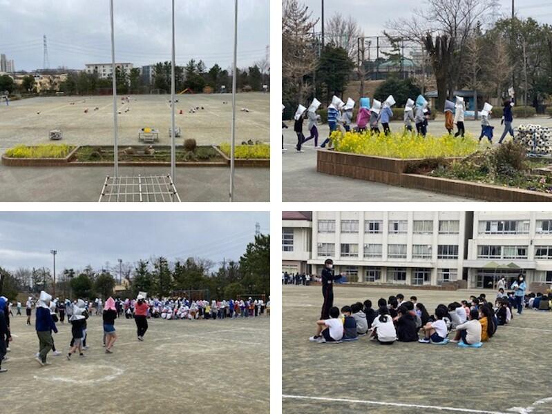 2年生はちょうど校庭で体育の学習をしており、校庭の真ん中付近で、ダンゴムシポーズをとりました。わかくさ学級はちょうど体育館で活動をしており、校舎内は通れないので、校舎の西側をぐるっと回るという、長い距離の避難となりました。