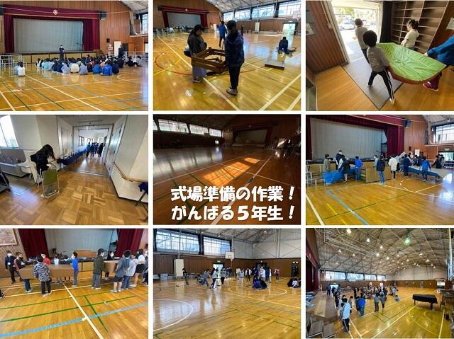 今日は、卒業式に向けた式場準備の作業日です。5年生たちが、頼りがいのある姿で頑張りました。実は、新型コロナウイルス感染症の影響で、5年生は卒業式に列席することができません。卒業式にかかわることで、自分たちの1年後の卒業に向けてのイメージや決意を新たにする良き機会なので、本当に残念です。ですが、卒業に向けた学びはぜひスタートさせたい。そういう意味でも、今日の式場作りの作業は、とても大切な学びの場となります。5年生も体育館に集まったときは、ざわざわ落ち着かない雰囲気でしたが、しっかりと緊張感のスイッチを入れることができました。