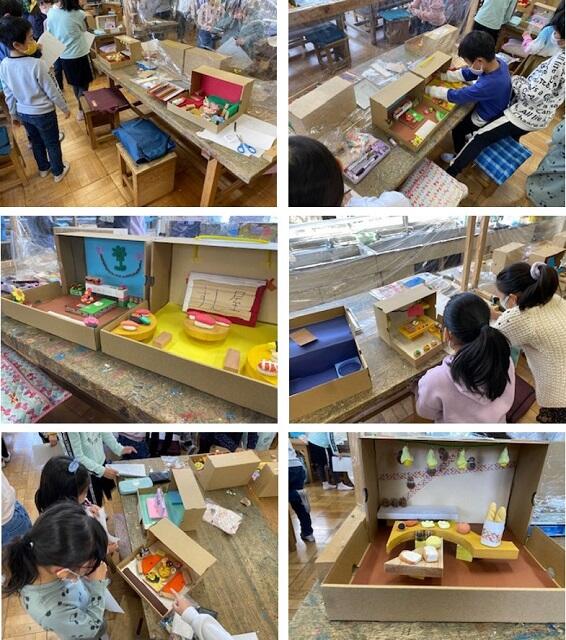 ちょうど大人の靴を入れるくらいの箱を使い、その中に、木片や紙粘土を使って、思い思いの「お店屋さん」を作りました。現実にあるお店の趣と、それぞれの創造性豊かな工夫が重なり合って、とっても素敵なお店屋さんになっています。木片の使い方、紙粘土での細やかな作業、さすが3年生!の雰囲気も感じます。