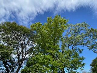 桜の花びらもだいぶ落ちてしまいましたが、周囲の木々の緑が本当にきれいになってきました。「緑色」と一言で言いますが、よく見ると濃淡や明るさなど、それぞれが違い、緑がグラデーションのように見えます。開いたばかりの新し葉が、きらきらと輝いています。