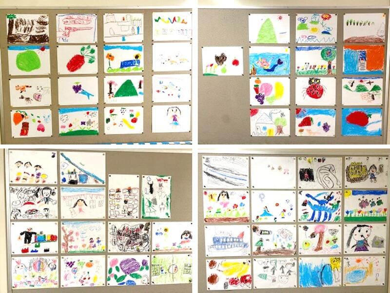 1年生の教師前の廊下の壁に、素敵な絵が展示されています。1年1組、2組のみんなが思い思いに描いた素敵な作品です。クレヨンを使って、一生懸命に描きました!