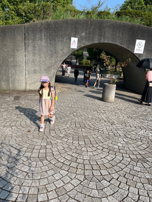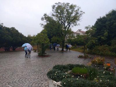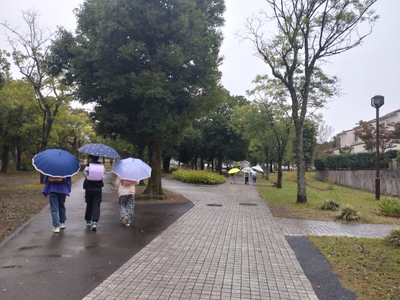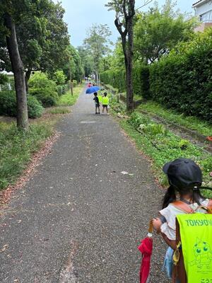 歩道やタイルがしっとり濡れており、滑りやすい場所がないか、自転車のイレギュラーな動きがないかなど、注意して付き添いました。