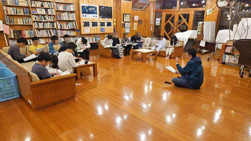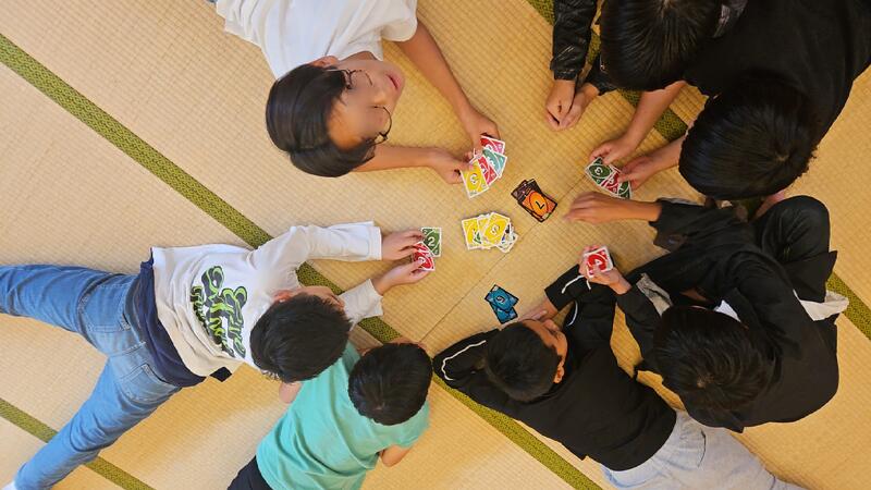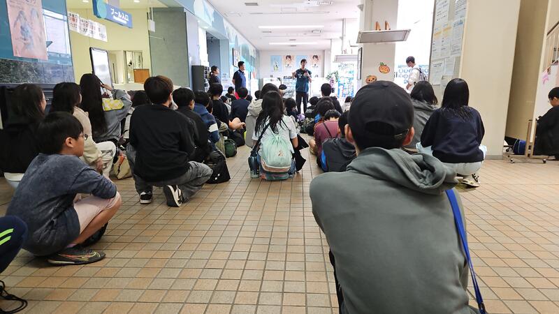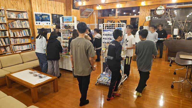 当初予定していた周辺散策は、濡れた靴を乾燥室で乾かしているため、自由時間に変更となりました。子どもたちは、それぞれの部屋やホールで思い思いに過ごしています。廊下に出て、少年自然の家に飾られた掲示物を熱心に見ている姿も見られました。しっかりとリラックスしています。