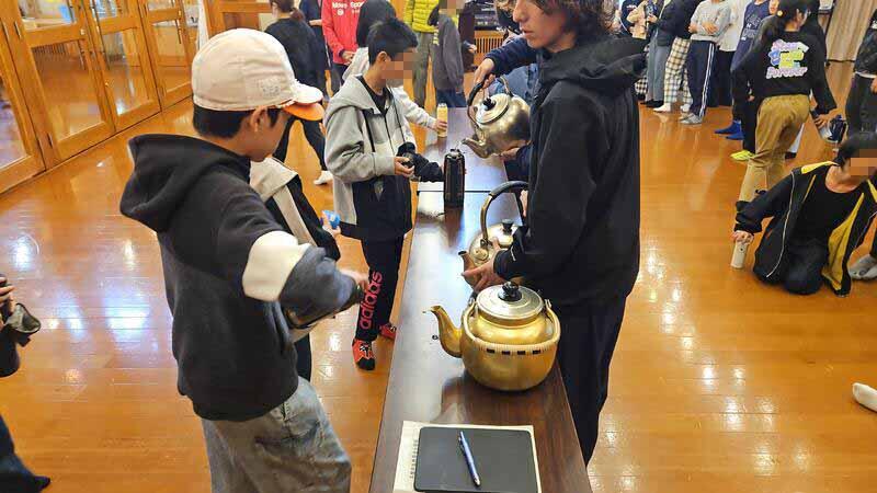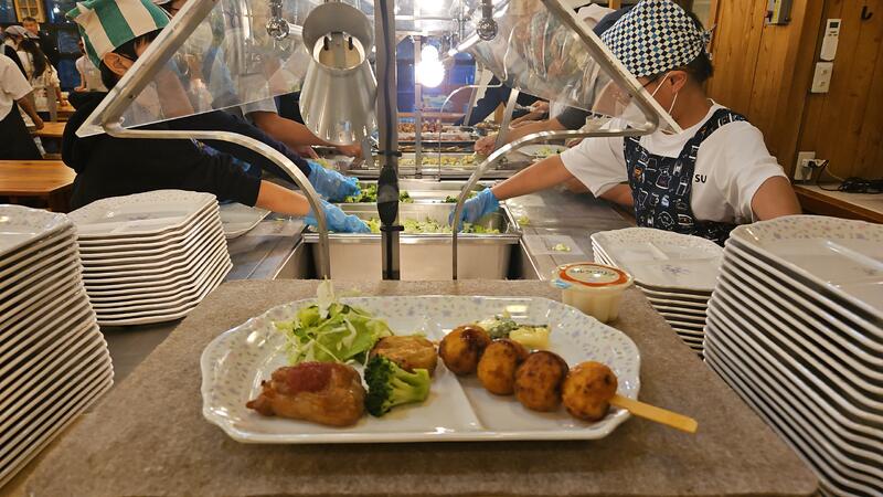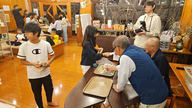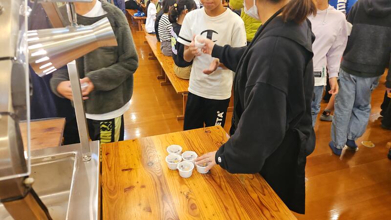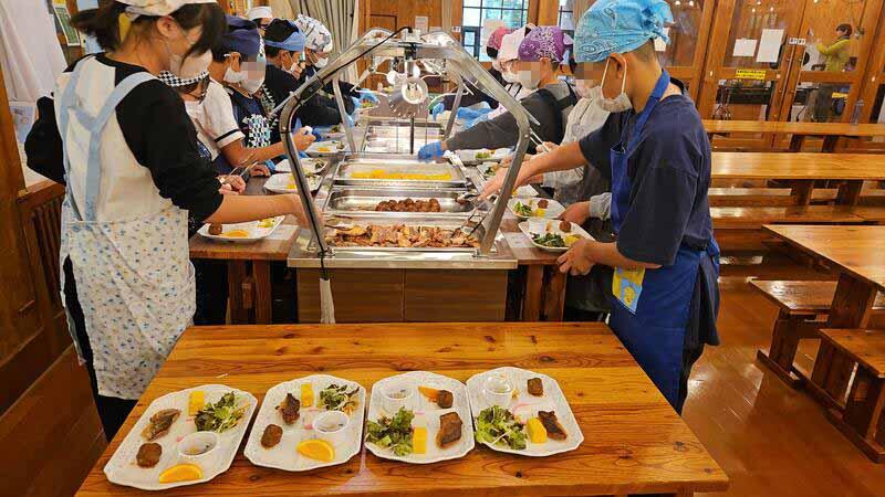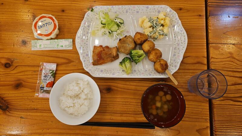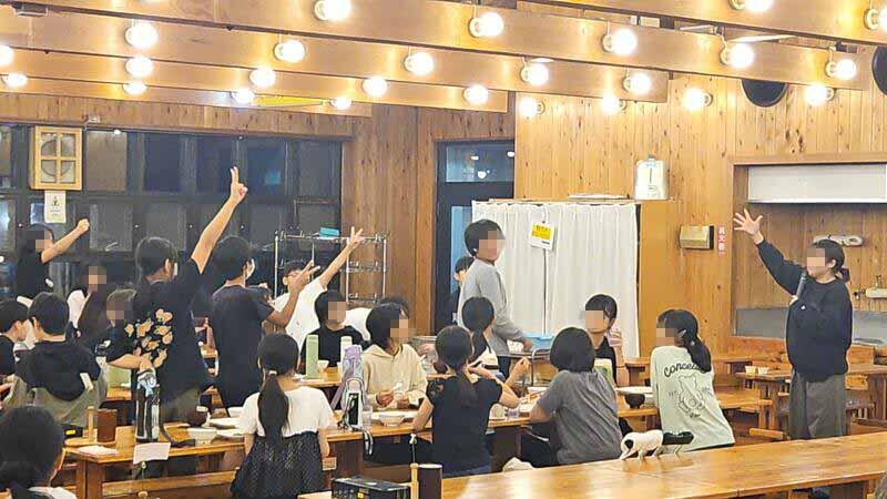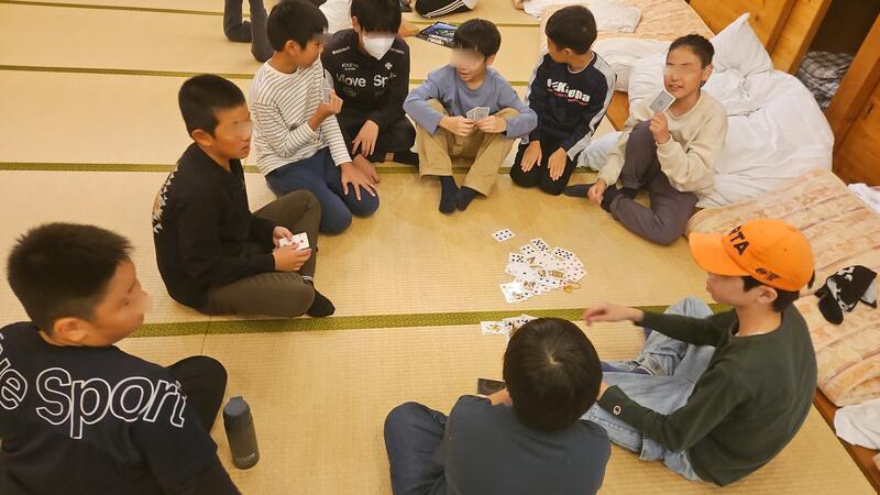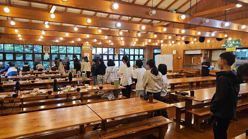 食事係の誘導で席に着いた6年生は、元気な「いただきます」の合唱とともに、勢いよく食べ始めました。今日のメニューは、グリルチキン、たこ焼き串、焼きじゃが、サラダ、スープ、そしてミルクプリンという豪華な食事。みんな、今日の出来事を話題にしながら、美味しい食事をしっかりいただきました。食後にはデザートのミルクプリンをめぐるじゃんけん大会も発生し、終始笑顔あふれる楽しい時間となりました!