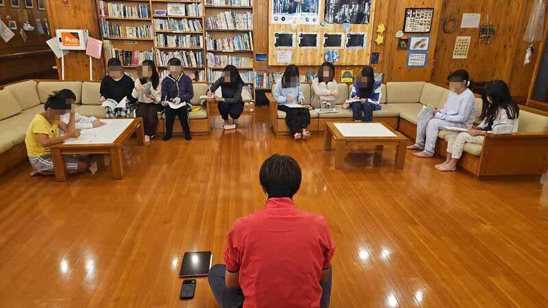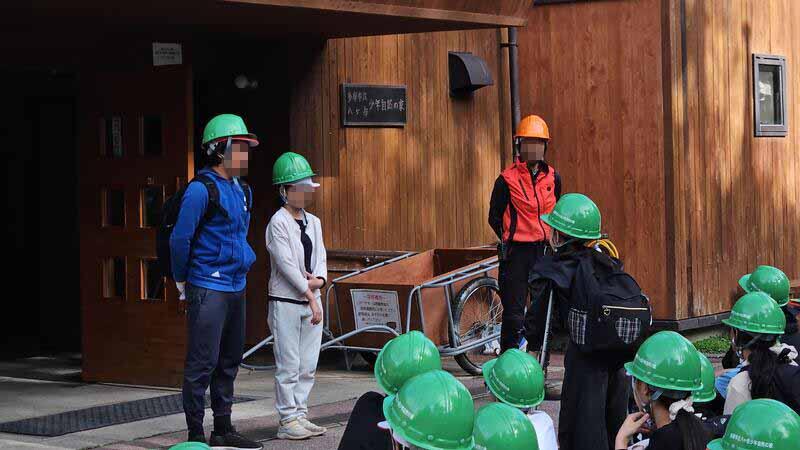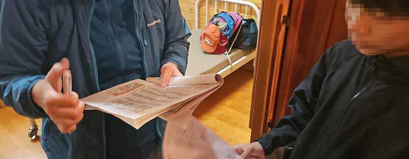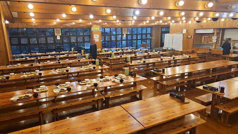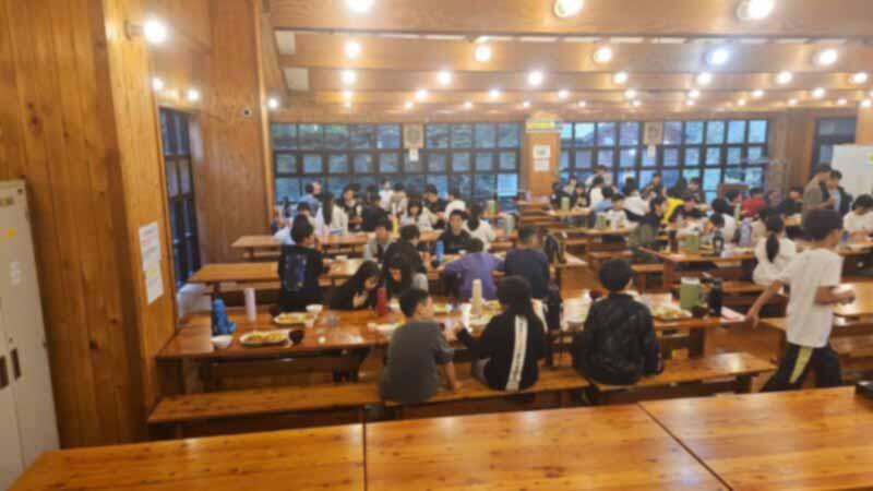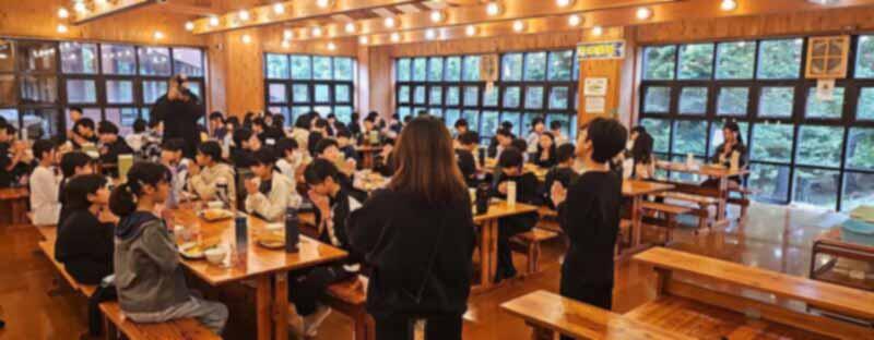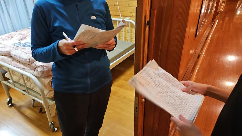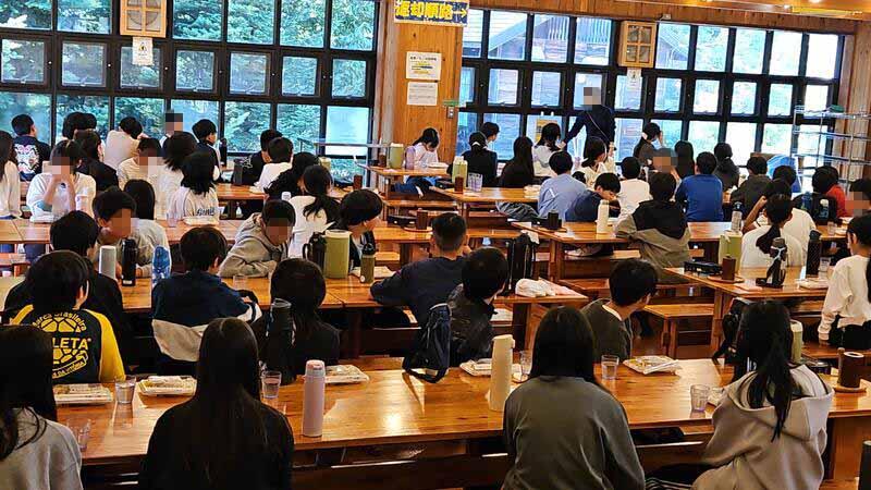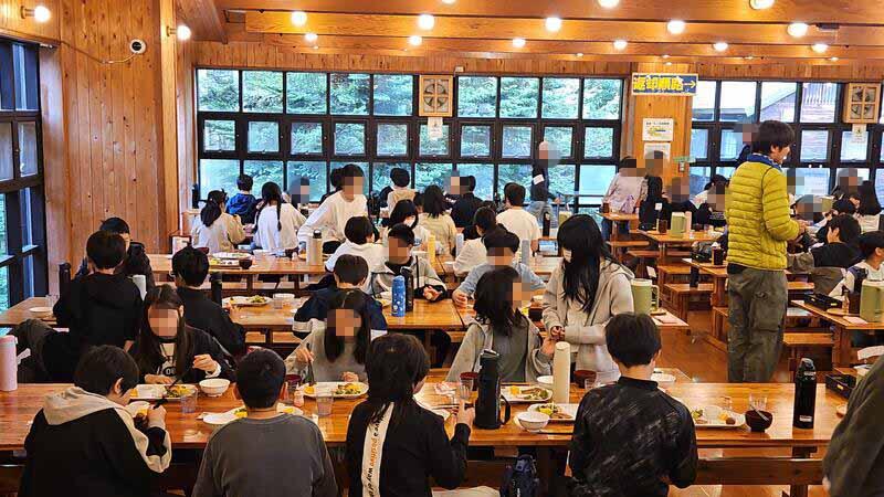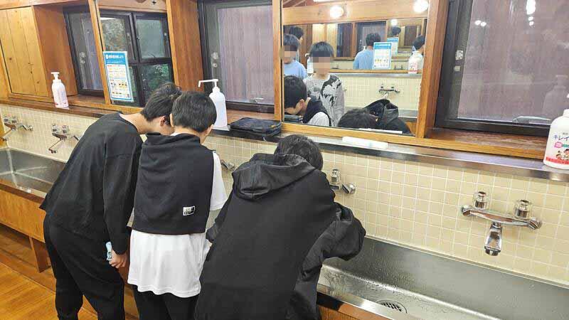 班長が急遽放送で集められました。当初この時間に靴を取りに行く予定でしたが、まだ乾いていないので、夕食後に乾燥室へ取りに行くことに変更になりました。また、男子トイレのスリッパが乱れているとのある班長からの報告があり、宿舎での過ごし方(しおり14P)を再確認。全員で意識を高め合うことにしました。