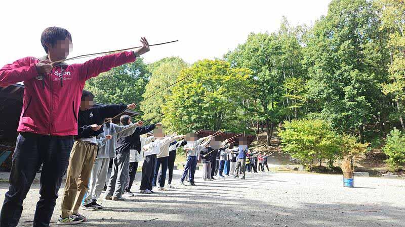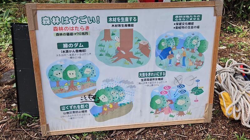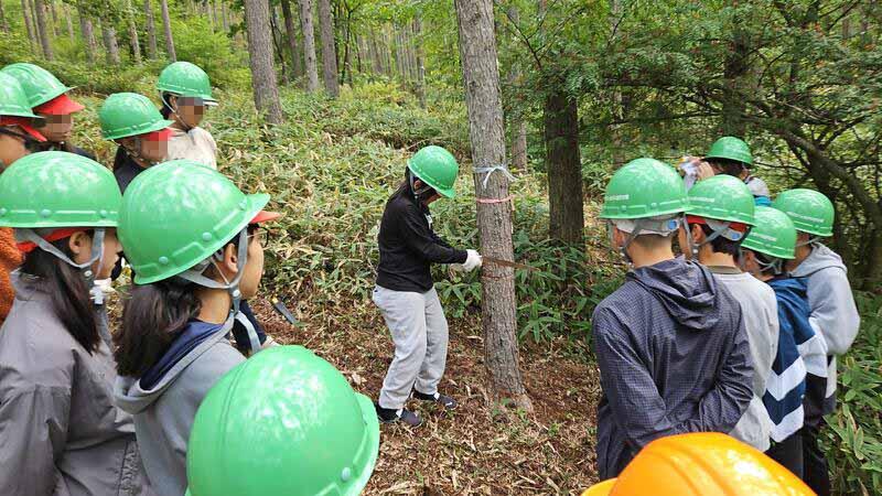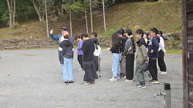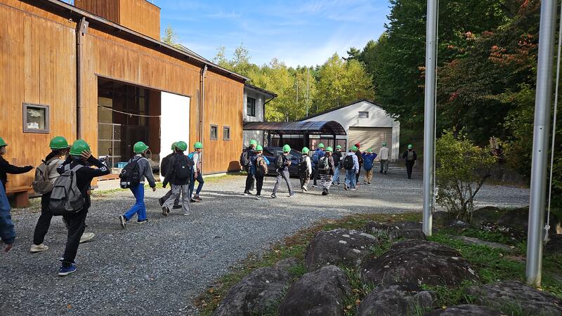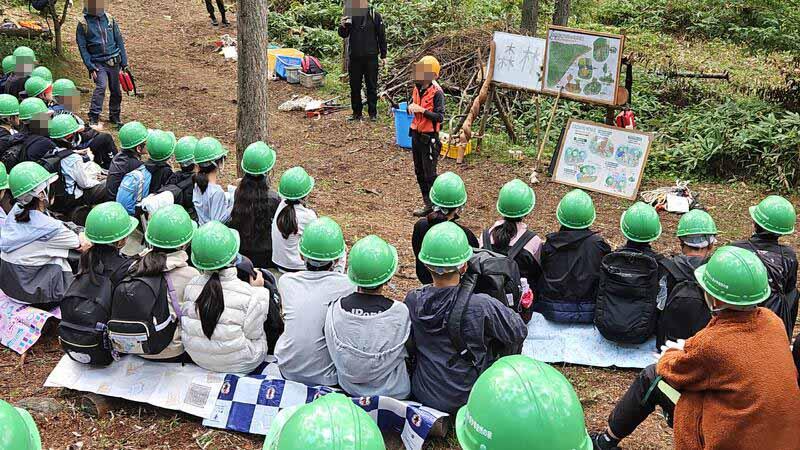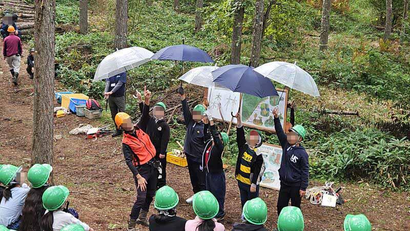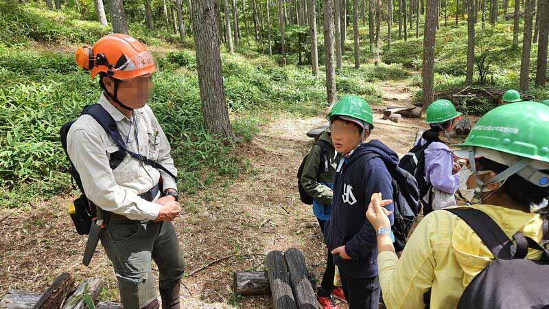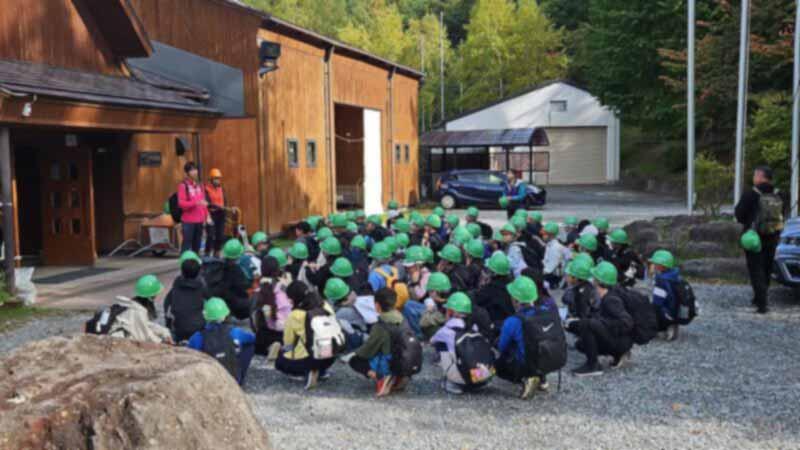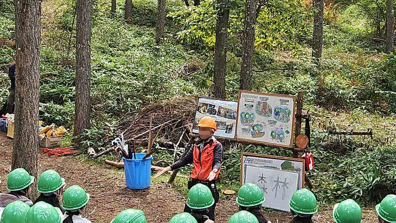 まずは森林教室の講義を受けました。ここでは、間伐(かんばつ)の目的や方法について深く学びました。特に、代表児童5名が木になったつもりで演技をしてくれたことで、間伐の必要性がとても分かりやすくなりました!座学を終え、いよいよこれから6つのグループに分かれて、実際の間伐作業に入ります。