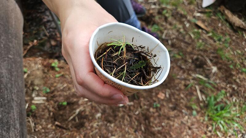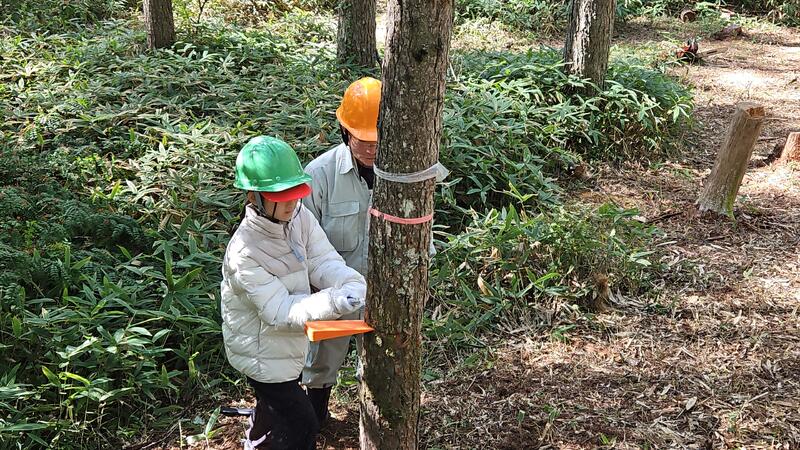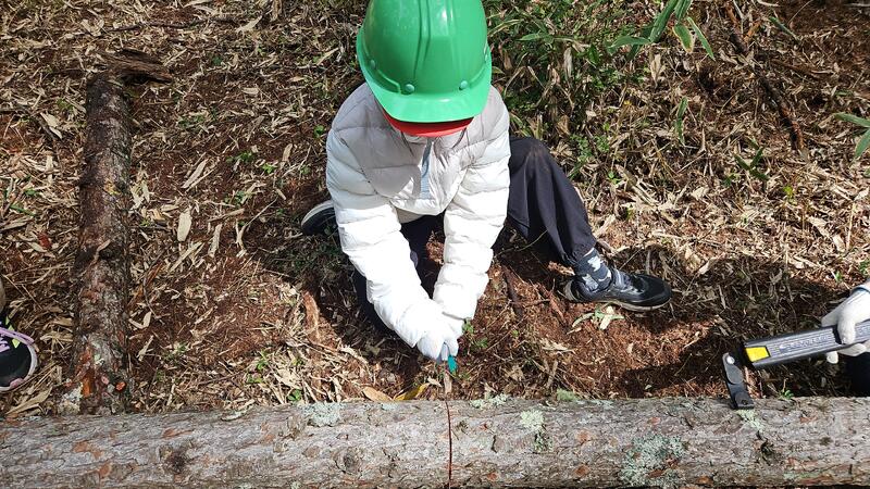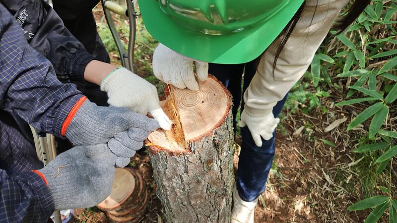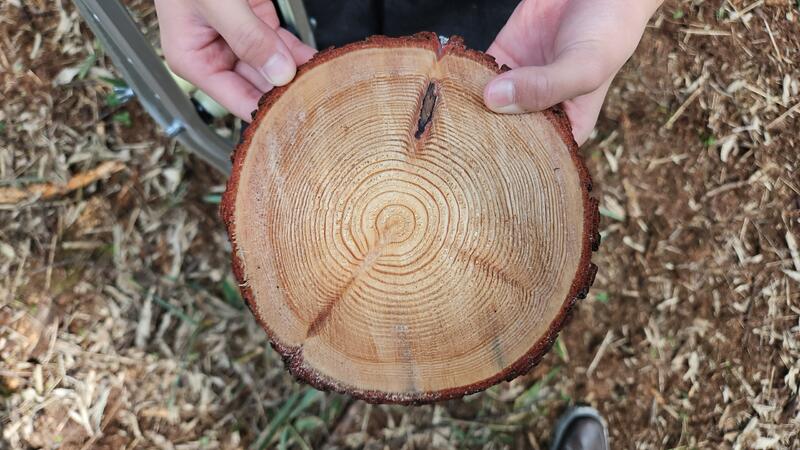 間伐作業で切り倒した木の一部を、頑張った記念として子どもたち一人ひとりがいただきました!これは、みんなが協力して活動を頑張った証です。持ち帰った木材は、お家で上手に乾燥させて、今日の思い出のオブジェにできるといいですね。全ての作業が終わった後も、上を向いて木を眺めたり、切り株の年輪を数えたりしていました。