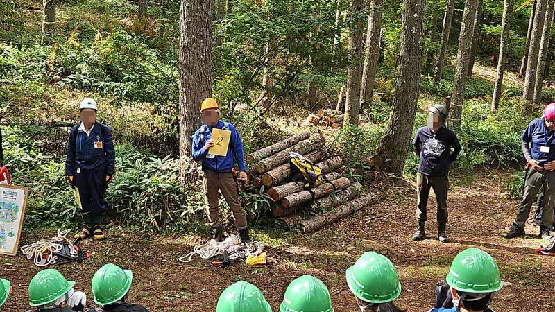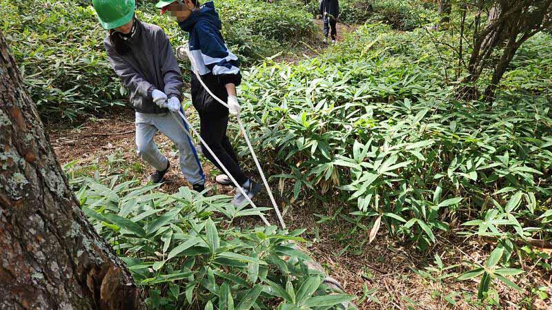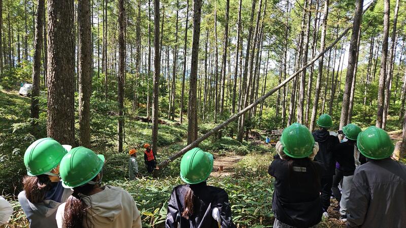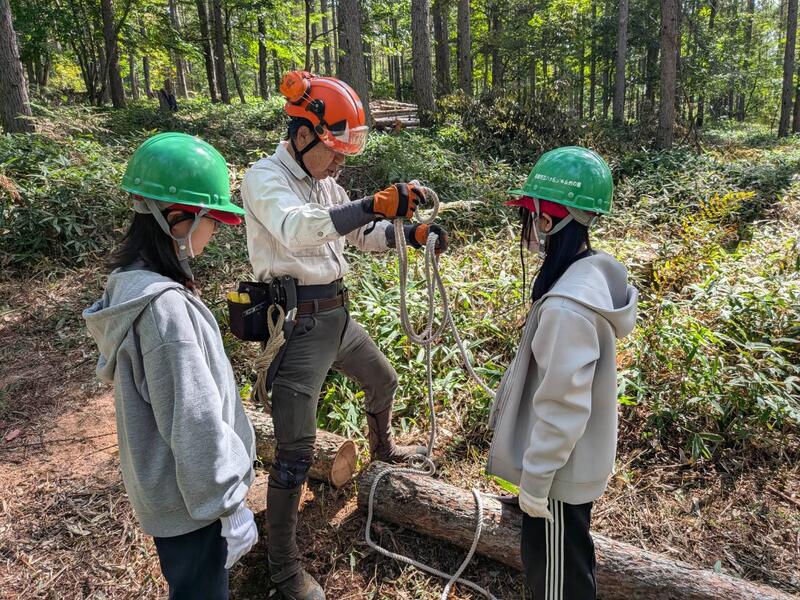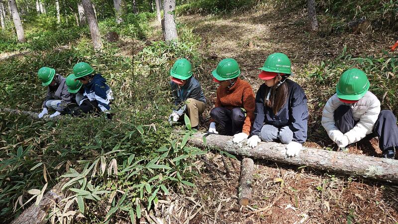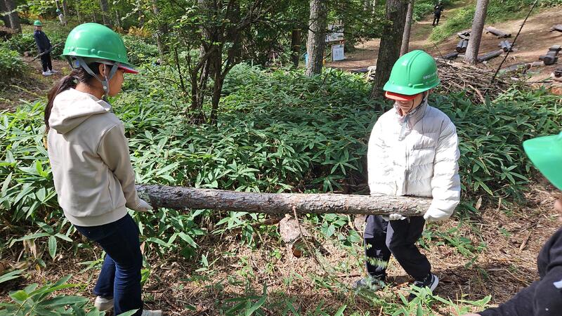 力を合わせて木を切り倒した後、次は切り分けと運び出しの作業です。切り倒した木を、3人一組で交代しながら短い木材に切り分けました。その後、短くした木材を木材置き場まで運びます。手で運んだり、ロープを使って引っ張ったりと、みんなで協力して運びきりました。
