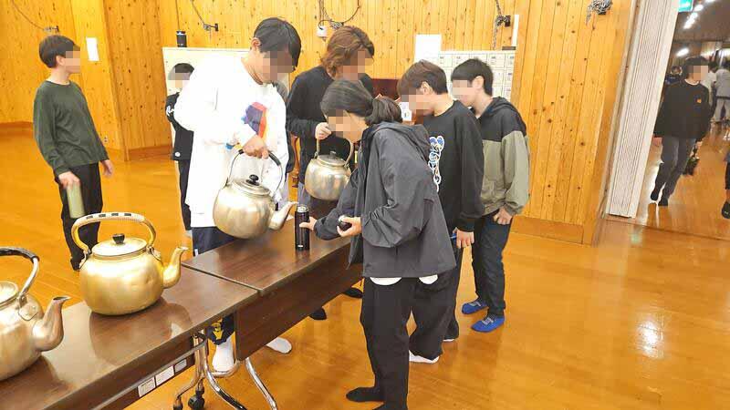 夕食前の準備と平行して、水筒の中身を空にして洗い、食堂の前で先生から新しい水を補充してもらいました。気温はそれほど高くありませんが、活動で失われた水分を補給することはとても大切です。水分補給の意識は常に高めたいです。