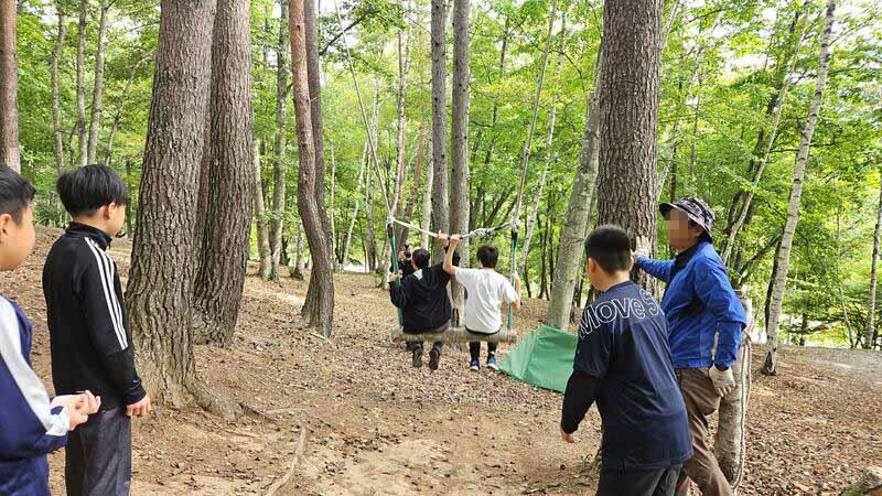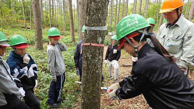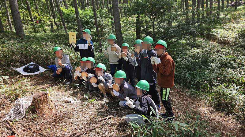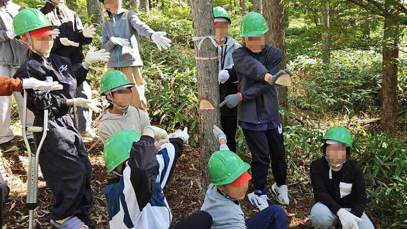 森林体験は、いよいよ実践の間伐作業に移りました!子どもたちはグループごとに協力しながら、ノコギリを使った作業に挑戦しています。安全に注意しながら、一人15回ずつ×4周を数え、交代しながら木を少しずつ切っています。時間はかかりましたが、切り落とせました。