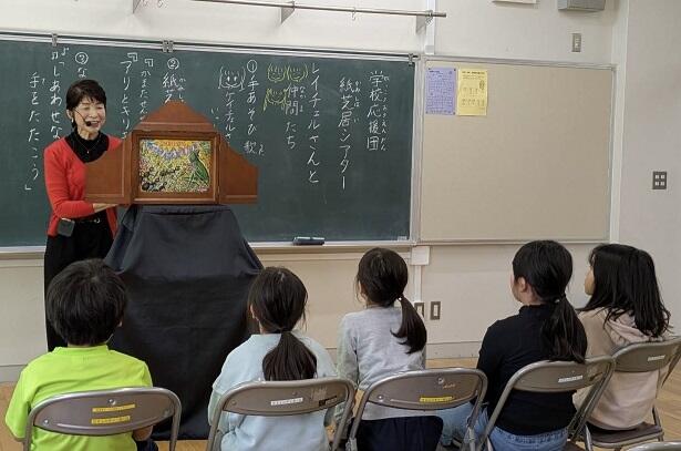 次に『がんばれサンタさん』を演じ始めると、1年生から5年生、先生方も加わって、紙芝居シアターが一気に賑やかに。玄関から「おじゃましま〜す」と入っていくサンタさんのお話に、みんな楽しそうに見入っていました。