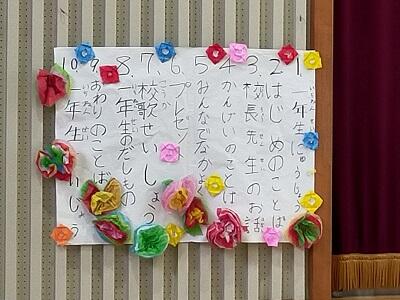 今年度は46名のピッカピカの1年生。緊張した雰囲気の中、長い時間しっかりと座り、話もしっかりと聞ける素晴らしい1年生でした。歓迎の言葉は、6年生の代表4名が堂々と発表してくれました。そして、2年生全員からは歓迎の歌と合奏がありました。新1年生も1年後はあんなに立派な2年生になります。そんな希望になる素敵な2年生の出し物でした。