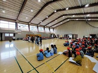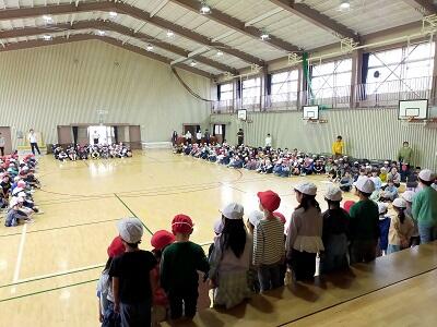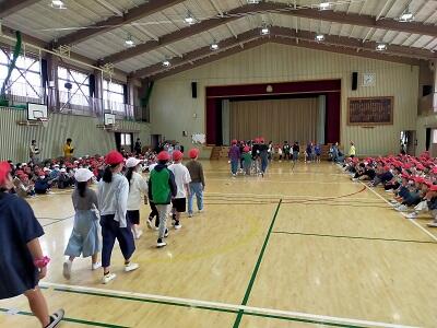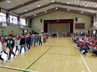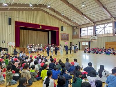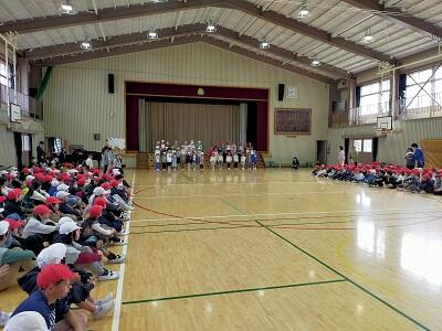 6年生と手をつないで入場し、緊張した面持ちの1年生でしたが、会が進むにつれて、笑顔がこぼれてきました。代表委員会が中心となり、「歓迎の言葉」「全校でクイズ大会」「プレゼント」と続きました。さらに全校児童の「校歌」のプレゼントは、なかなかの大迫力でした。1年生からもお返しの歌がありました。一生懸命な1年生の様子を見ていると、ほっこりした気持ちになりました。この式で全校デビューした1年生の成長が楽しみです。