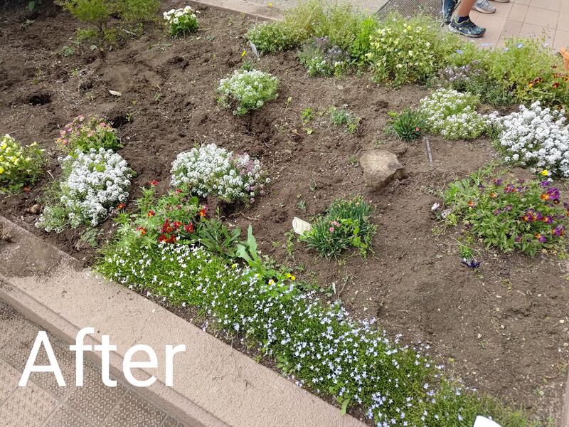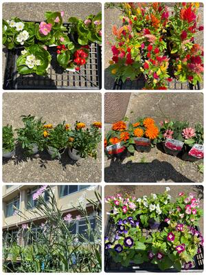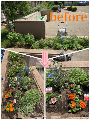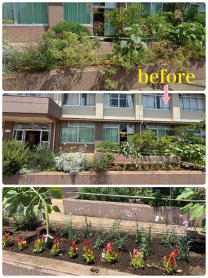 朝から30度以上の真夏日、炎天下の中サポスタの皆さまのお力を借りて、正面玄関両脇2カ所、東門前、学童横に6種類の苗を植えました