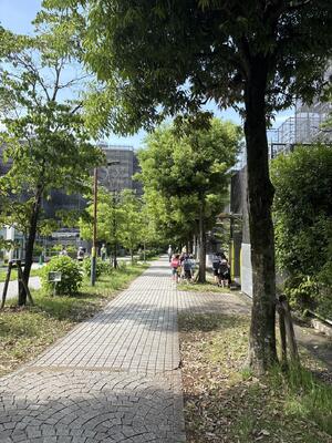 写真の左側の道は少し狭く、自転車や人がすれ違う際に植え込みに足を取られたり、バランスを崩す可能性があります。