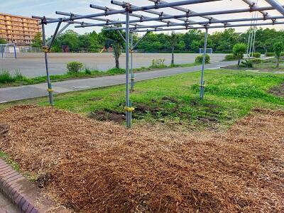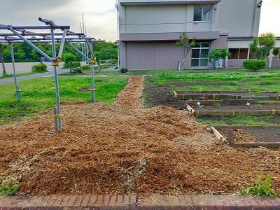 今年度の新しい取り組みとして、校舎東側にある畑をリニューアルしています。これまで、3年生や6年生、環境委員が様々なものを育てていました。結構な広さがあるので、活用しきれていないところを有効活用しようということで、学童とコラボをして共同の「ガーデン」作りに取り組んでいます。学童の子どもたちや職員さんも総出で草刈り、耕しの作業をしてくださり、「手作りのレイズドべッド」も完成しました。子どもたちがお世話や観察が容易になりました。学童と学校の境目としてウッドチップの道も出来上がりました。少しずつ手を掛けて素敵な「ガーデン」にしてきたいです。