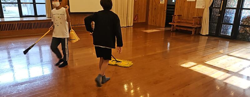 合言葉は「来た時よりも美しく」。美化係が中心となり、みんなで協力して、使った場所を中心に朝から気持ちよく清掃を進めています。各自の荷物整理もテキパキと完了。自分たちが使った場所に感謝の気持ちを込めて、きれいにできました。自分で気付いたことを自主的に取り組んでいる子もいます。