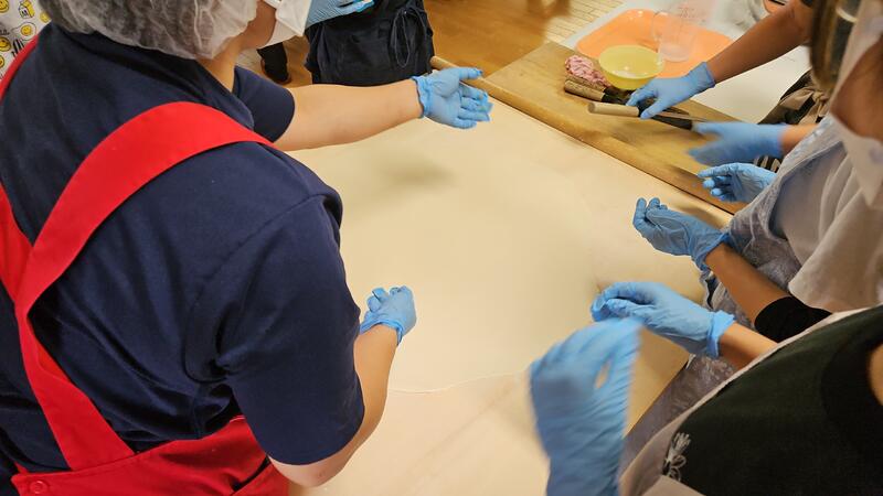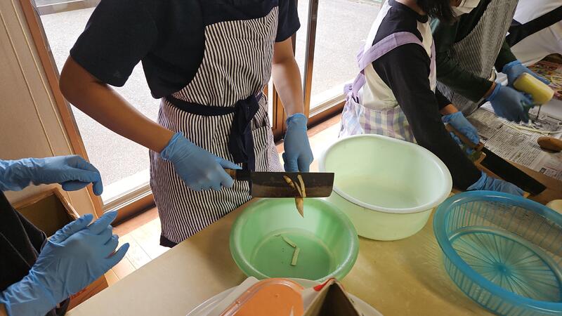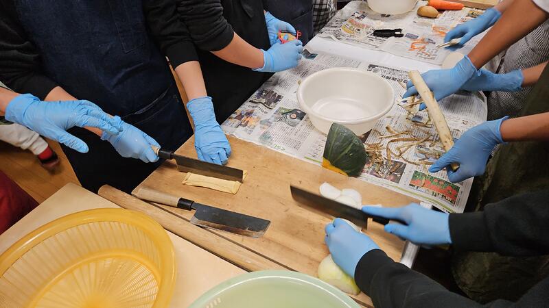 いよいよ楽しみにしていたほうとう作り、調理開始です!まずは、班ごとに協力して野菜を切る作業に取り掛かりました。ごぼうは回しながら包丁で丁寧に切っています。かぼちゃは固くて大変!力を合わせて奮闘中です。にんじんはピーラーで皮をむいてから包丁で切る、というように手順も確認しながら進めました。他にも、じゃがいも、玉ねぎ、油揚げなど、具材がどんどん準備されていきます。みんな真剣な表情で包丁を使い、おいしいほうとうを作るために頑張っています!