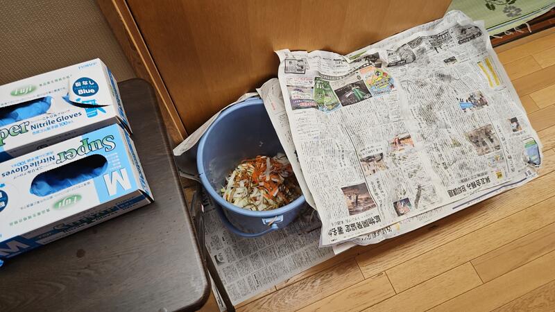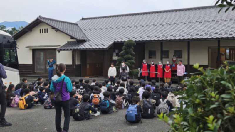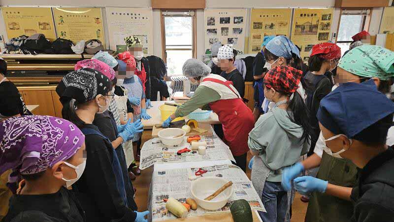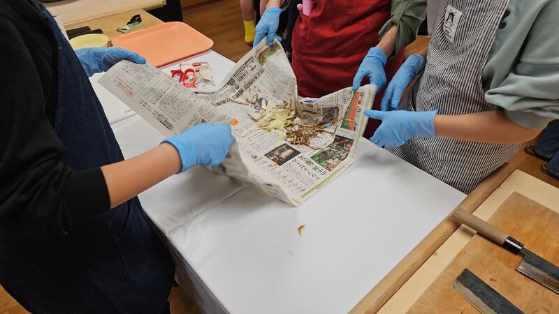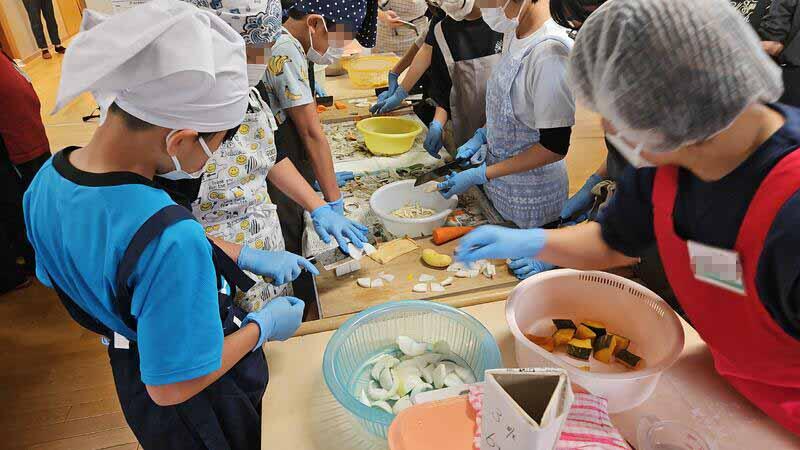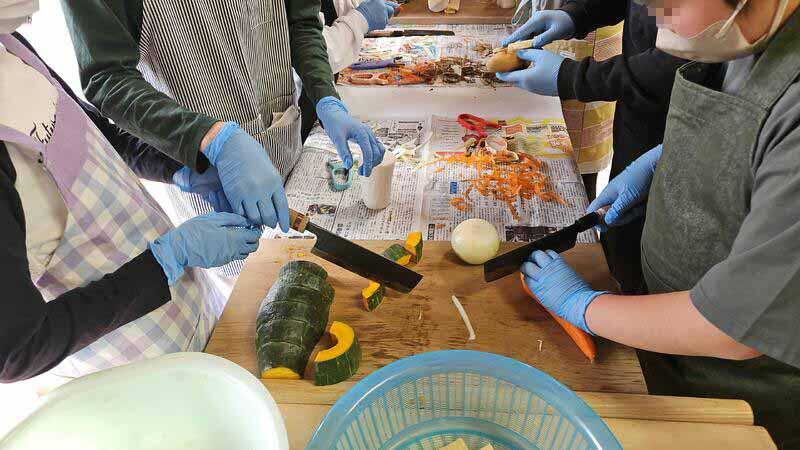 子どもたちが切った具材は、スタッフの方に渡され、大きな鍋で煮込んでいただきます。また、調理で出た野菜の皮などは、一カ所に集められました。これらは無駄にせず、畑に返して肥料にするとのことです。自然の恵みを大切にする、すてきな取組を学ぶことができました!