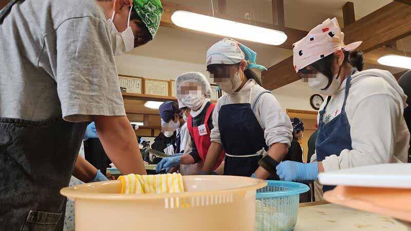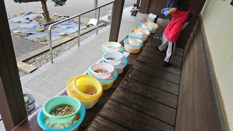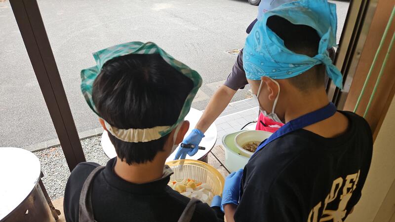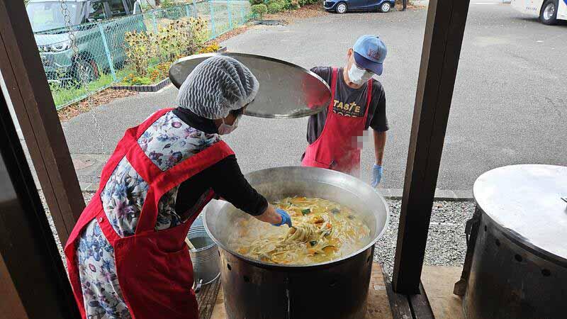 麺切りが終わった班から、麺を大きな鍋のところまで運び、スタッフの方にお渡ししました。先に入っている具材と今切った麺が、大きな鍋の中で味噌ベースのお出汁とともにじっくりと煮込まれます。あとは出来上がりを待つだけです。