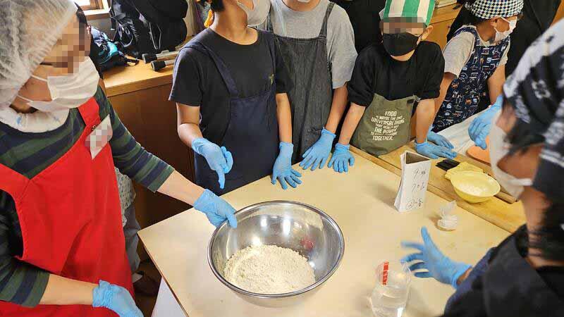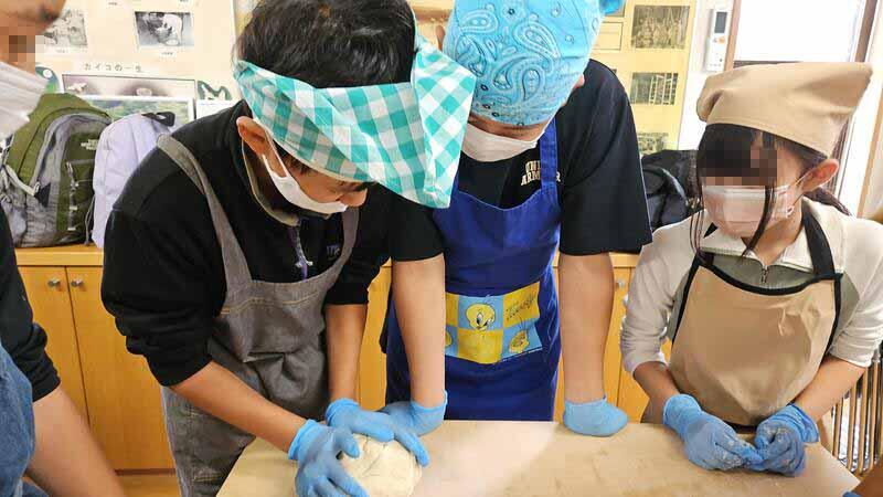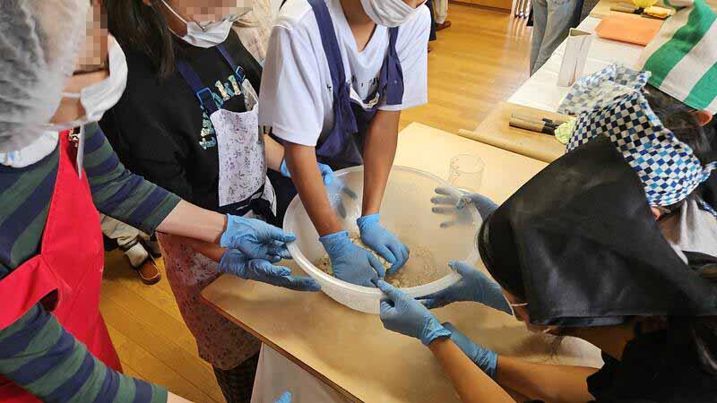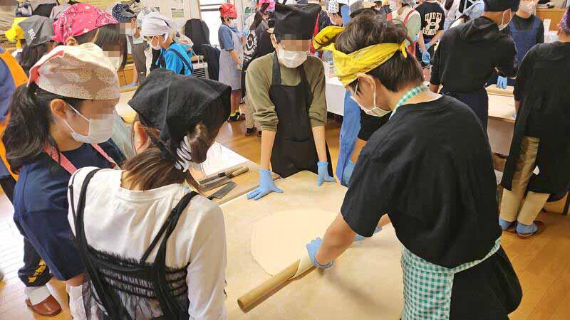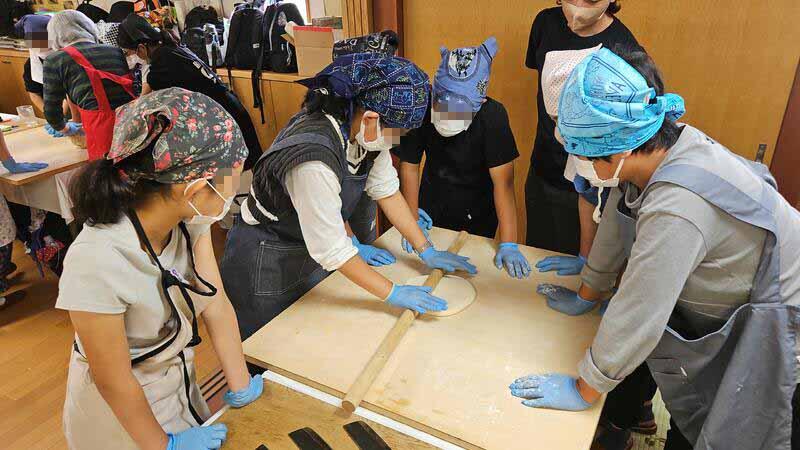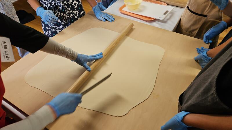 いよいよほうとうの麺作りです!まずは、小麦粉に水を混ぜて、みんなで力を合わせて生地をこねます。最初は粉っぽかった生地も、手のひらと腕の力でだんだんとまとまっていきました。こねた生地を人数分に切り分け、さらに各自でしっかりと「耳たぶ」くらいの柔らかさになるまで丁寧にこねていきます。その後、再びすべての生地を合体させました。
