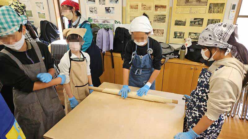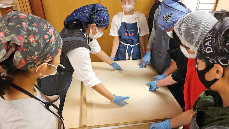 いよいよ麺棒を使って伸ばします。子どもたちはみんなで交代しながら、力を込めて大きな塊を広げていきます。目標は厚さ2mmです。あの塊がどんどん薄くなりました。