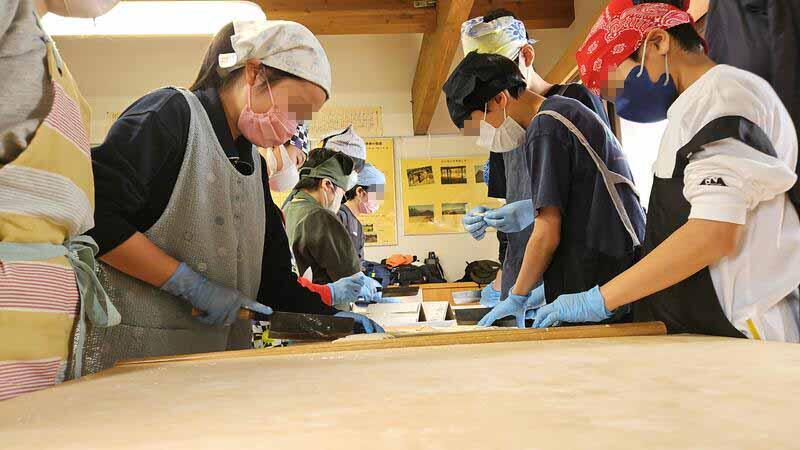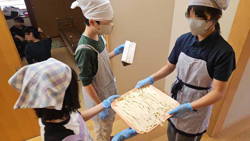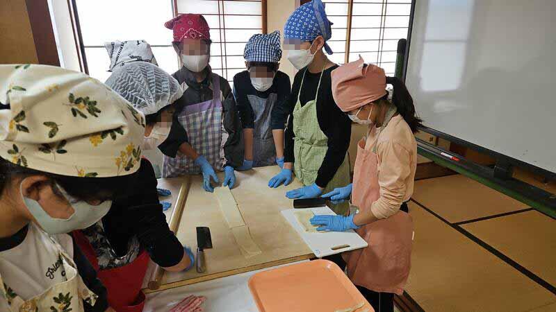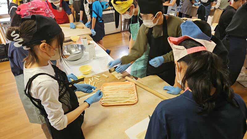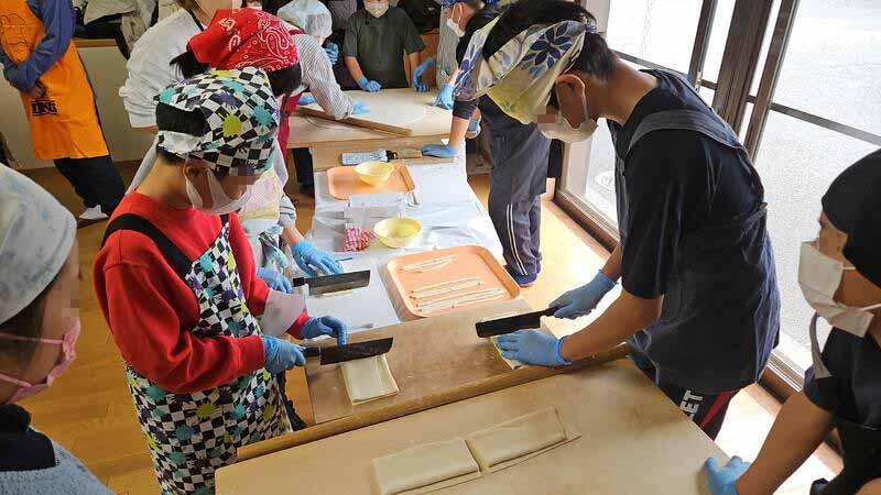 いよいよ麺を切ります。生地を四つ折りにし、幅8mmで均等に切っていきます。スタッフの方によると、この8mmという幅がポイントだそうです!薄いと煮崩れてしまい、太すぎると味が染み込まない、ほうとうにとって最高の太さなのだとか。子どもたちは、なるべく美味しくなるようにと集中しながら安全に切っています。もう麺職人です。