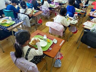 今日から1年生の給食が始まりました。小学校で初めて給食のメニューは「カレーライス」でした。給食の準備の仕方(給食ナフキンを敷く)からスタートして、配膳の方法、待ち方、牛乳瓶の開け方などなど、覚えることはたくさんありましたが、子どもたちは非常に落ちついて準備を進めていました。牛乳瓶をこぼしてしまう子の少なさには驚きでした。そして、強力な助っ人して「6年生当番」がしばらくの間、来てくれます。配膳係、個々のお手伝いなど、てきぱきとした動きはさすが6年生でした。6年生、しばらくの間よろしくお願いします。1年生の皆さん、小学校の給食のお味はいかがでしたか。