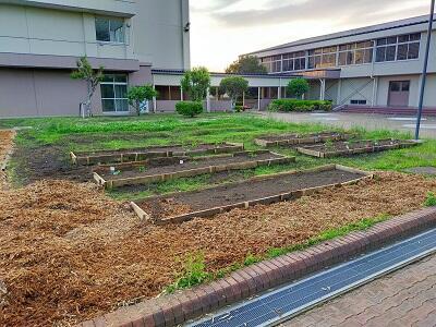今年度の新しい取り組みとして、校舎東側にある畑をリニューアルしています。これまで、3年生や6年生、環境委員が様々なものを育てていました。結構な広さがあるので、活用しきれていないところを有効活用しようということで、学童とコラボをして共同の「ガーデン」作りに取り組んでいます。学童の子どもたちや職員さんも総出で草刈り、耕しの作業をしてくださり、「手作りのレイズドべッド」も完成しました。子どもたちがお世話や観察が容易になりました。学童と学校の境目としてウッドチップの道も出来上がりました。少しずつ手を掛けて素敵な「ガーデン」にしてきたいです。
